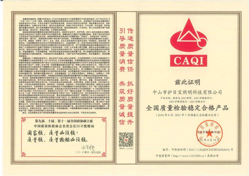 中国质检协会授予的“质量稳定合格产品”标识,是对企业产品稳定性、可靠性与生产管理能力的重要背书。此次获评,不仅是对护目宝照明长期坚持品质路线的肯定,也将进一步提升企业在教育照明、家居照明等领域的品牌竞争力。